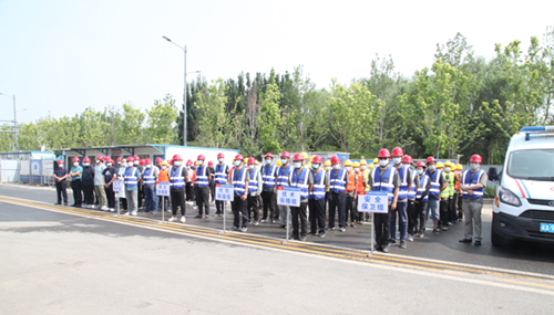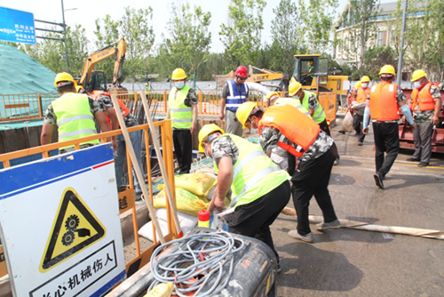 本次演練以因強(qiáng)降雨造成滹沱河和太平河洪水爆發(fā),即將對項(xiàng)目部造成威脅為背景,模擬項(xiàng)目部員工發(fā)現(xiàn)險(xiǎn)情后,立刻向項(xiàng)目部防汛值班領(lǐng)導(dǎo)報(bào)告,值班領(lǐng)導(dǎo)向指揮長進(jìn)行報(bào)告,指揮長下令立刻啟動(dòng)應(yīng)急預(yù)案,各應(yīng)急小組迅速進(jìn)入應(yīng)急備戰(zhàn)狀態(tài),配備防汛機(jī)具,迅速奔赴現(xiàn)場搶險(xiǎn),設(shè)置警示標(biāo)志和安全警戒區(qū)域,組織人員疏散,搶救重要物資,加固土坡,裝運(yùn)沙袋,同時(shí)組織修復(fù)道路,恢復(fù)交通,保證撤離路線暢通,進(jìn)行搶險(xiǎn)救援全過程。